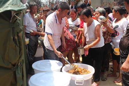 飲食制作小組除了保障本公司員工就餐外,還要做好災(zāi)民飲食保障工作。送飯小組除了完成送飯任務(wù)外,還要幫助飲事小組工作,確保既不誤災(zāi)民吃飯,又不誤員工用餐。